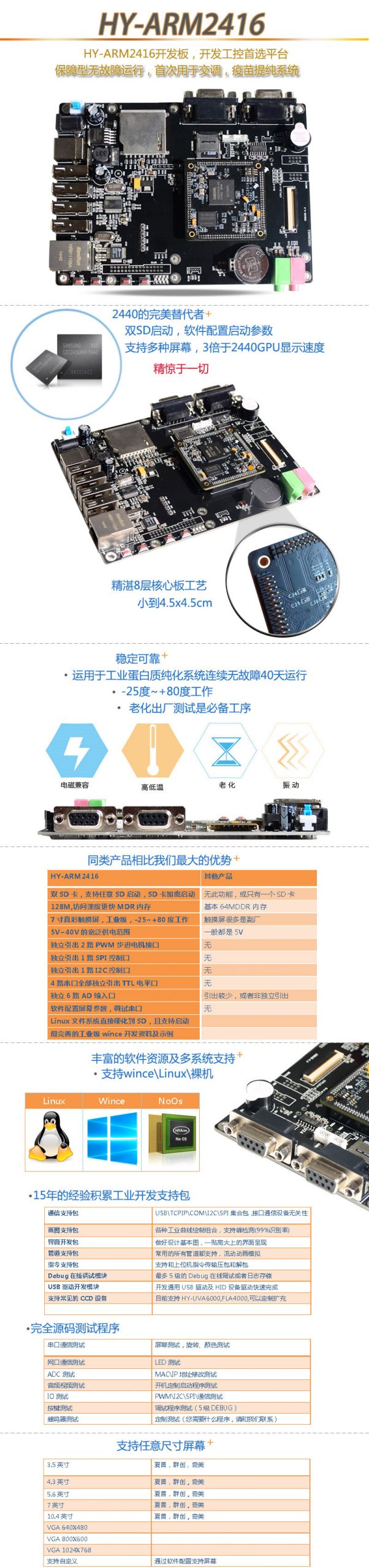 支持SD卡啟動, 支持linux, WINCE 雙系統. 隨機贈送全部開發資料及源碼.上手及其容易, 將近8年的資料,讓您足不出戶, 學會,及熟練應用ARM板相關技術開發.大家可能對2416有點陌生, 因為此前接觸的都是ARM2440A, 2416是2440A的升級產品.對2440系列作了很多改進.